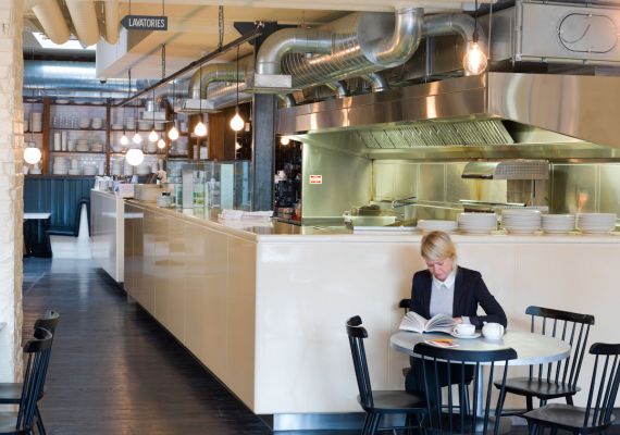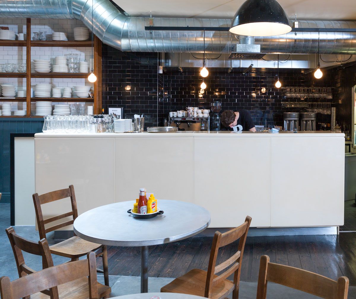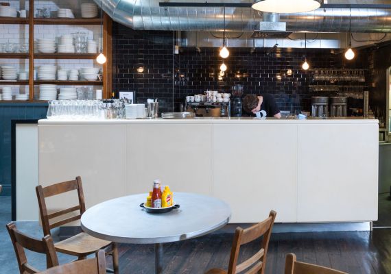 Simple and effective design in this popular industrial burger bar.